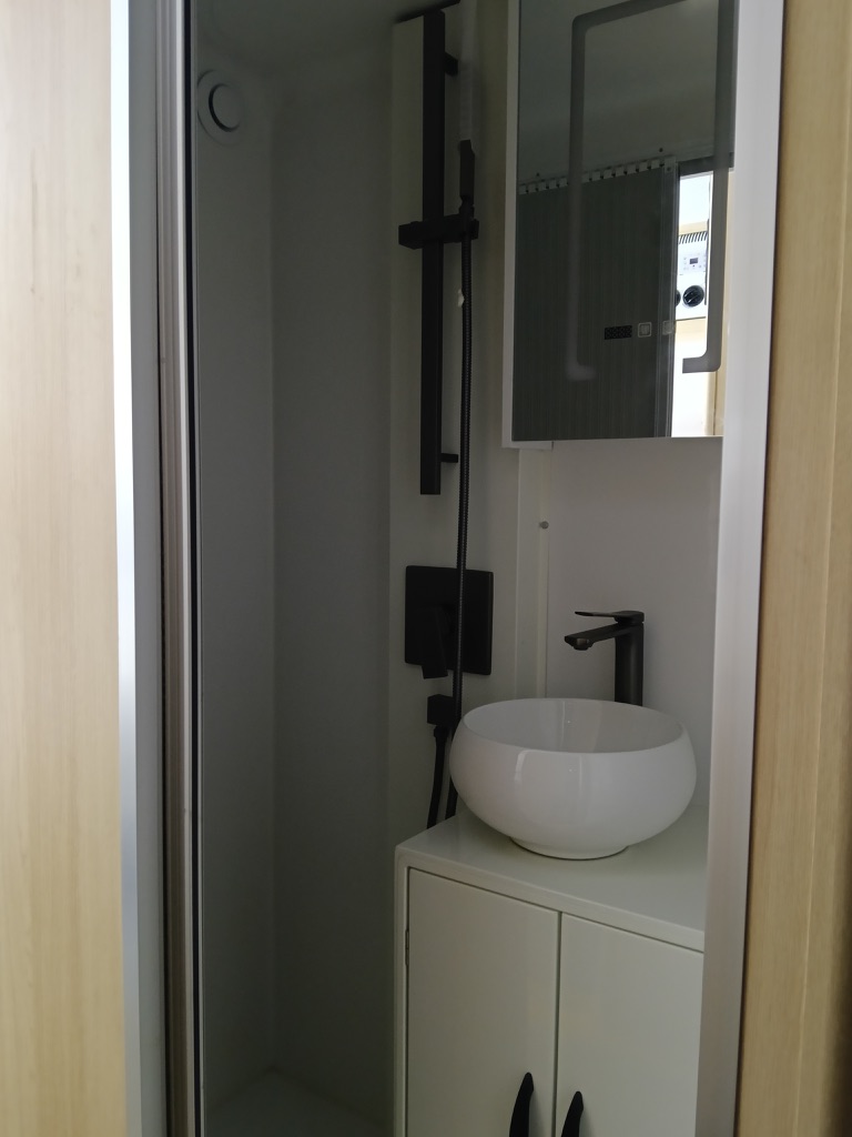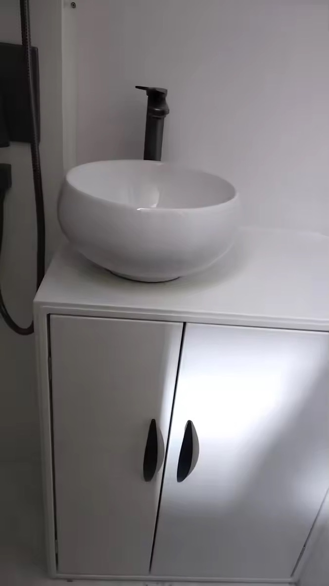 - —Bathroom: 3 overhead cabinets, 2 top shelves, 3 under-countertop shelves, 1 drawer and 2 storage spaces with doors