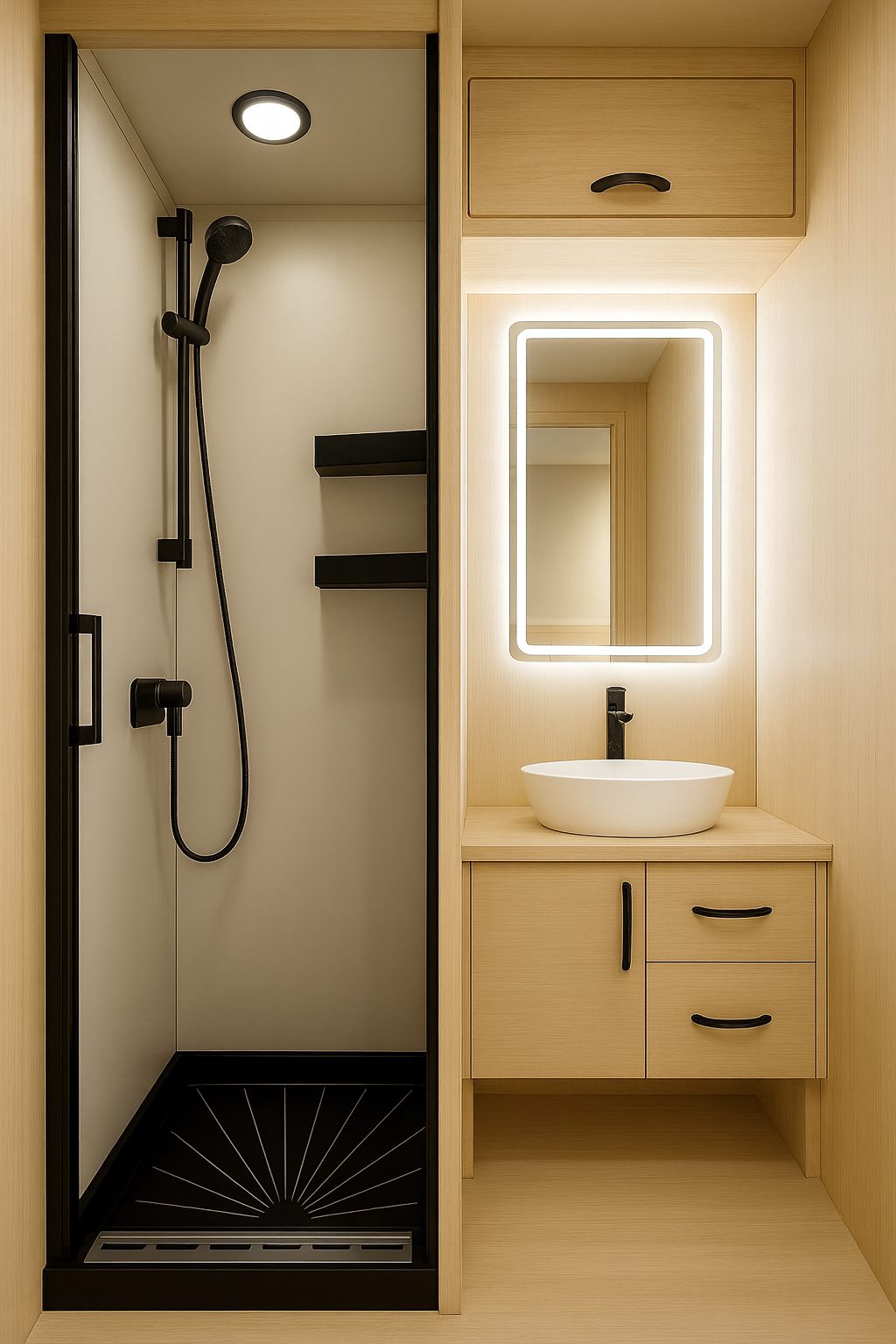 An expanded, modern bath with an oversized shower in matte-black fixtures, a backlit vanity for a premium glow, and generous shelving that keeps daily essentials within easy reach. The integrated dresser-and-wardrobe system organizes layers and gear, making it effortless to shift from rugged exploration to relaxed living—clutter-free, comfort-first.